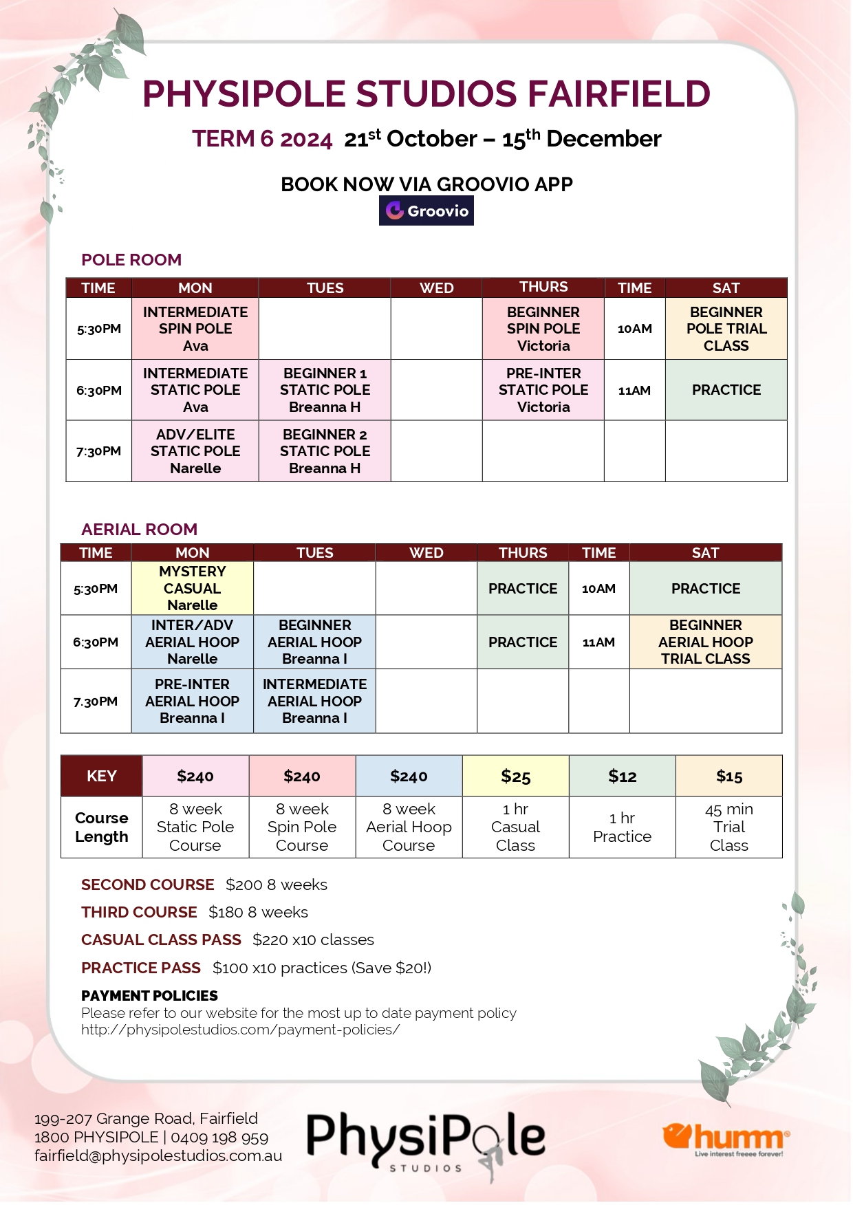 Welcome to PhysiPole Studios Fairfield – Your go-to destination for pole dancing and aerial hoop fitness in Melbourne. Boasting top-quality classes designed to help you build strength, confidence, and have fun while doing it, we cater to all fitness levels! Our team of skilled instructors provide expert guidance in static pole, spin pole and and aerial hoop courses, catering for beginners to advanced dancers and aerialists. We offer trial classes and private sessions in both pole and aerial hoop. Our venue also caters for group functions such as hens parties, perfect for making unforgettable memories with your friends. At PhysiPole Studios Fairfield, we welcome everyone, regardless of gender, age or fitness level, and pride ourselves on creating a supportive and inclusive community. Book your first pole or aerial hoop class with us today and experience the thrill of fitness like never before.